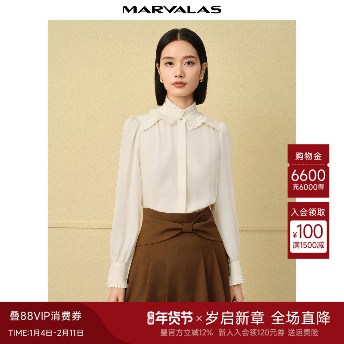 曼德诗纯色衬衫2025秋季新品时尚复古法式宫廷风木耳边立领衬衣女