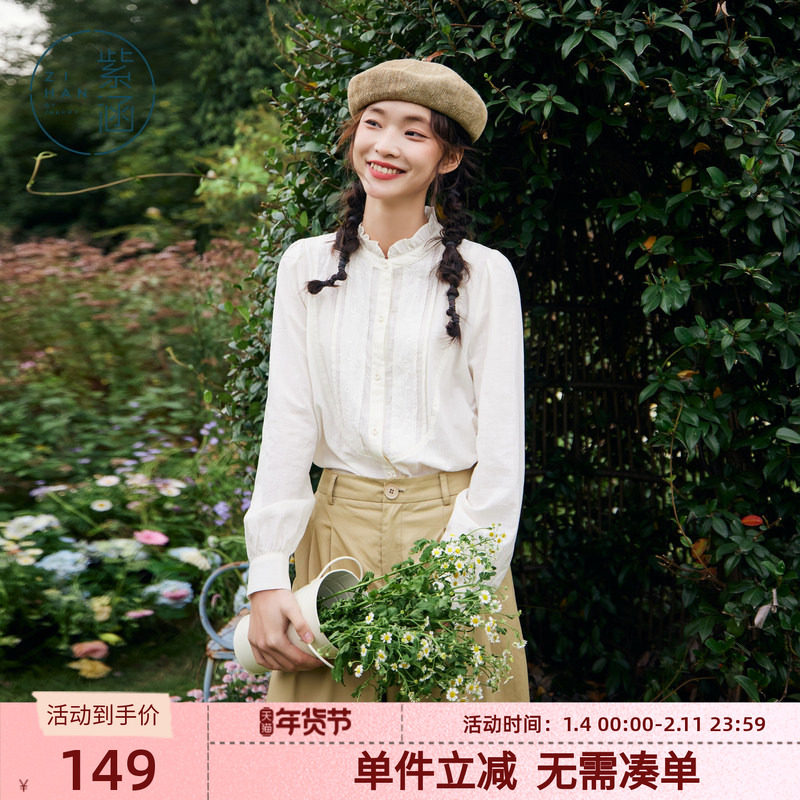 紫涵立领木耳边长袖衬衫女冬季新款纯色简约百搭宽松上衣内搭衬衣