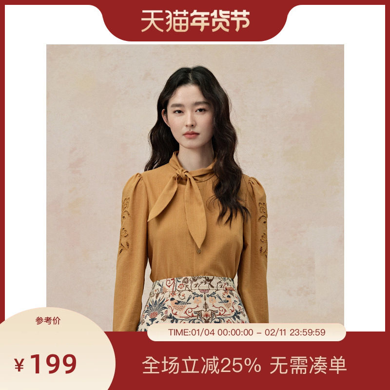 固执春新款复古立领泡泡袖蝴蝶结纯色长袖衬衫女10831CS07790