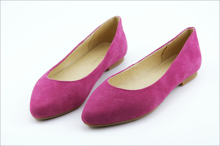 春季新款尖头浅口平底女鞋真皮玫红色磨砂皮百搭舒适软底女鞋单鞋