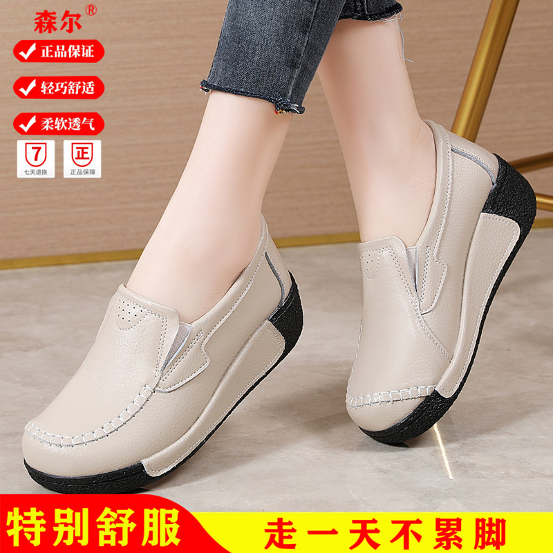 真皮女单鞋春秋款休闲一脚蹬妈妈鞋工作鞋厚底松糕鞋舒适软底女鞋