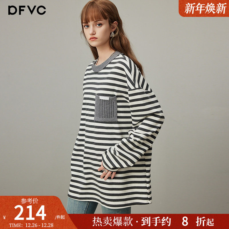 dfvc条纹圆领长袖T恤女2025年秋季新款宽松中长款卫衣内搭打底衫