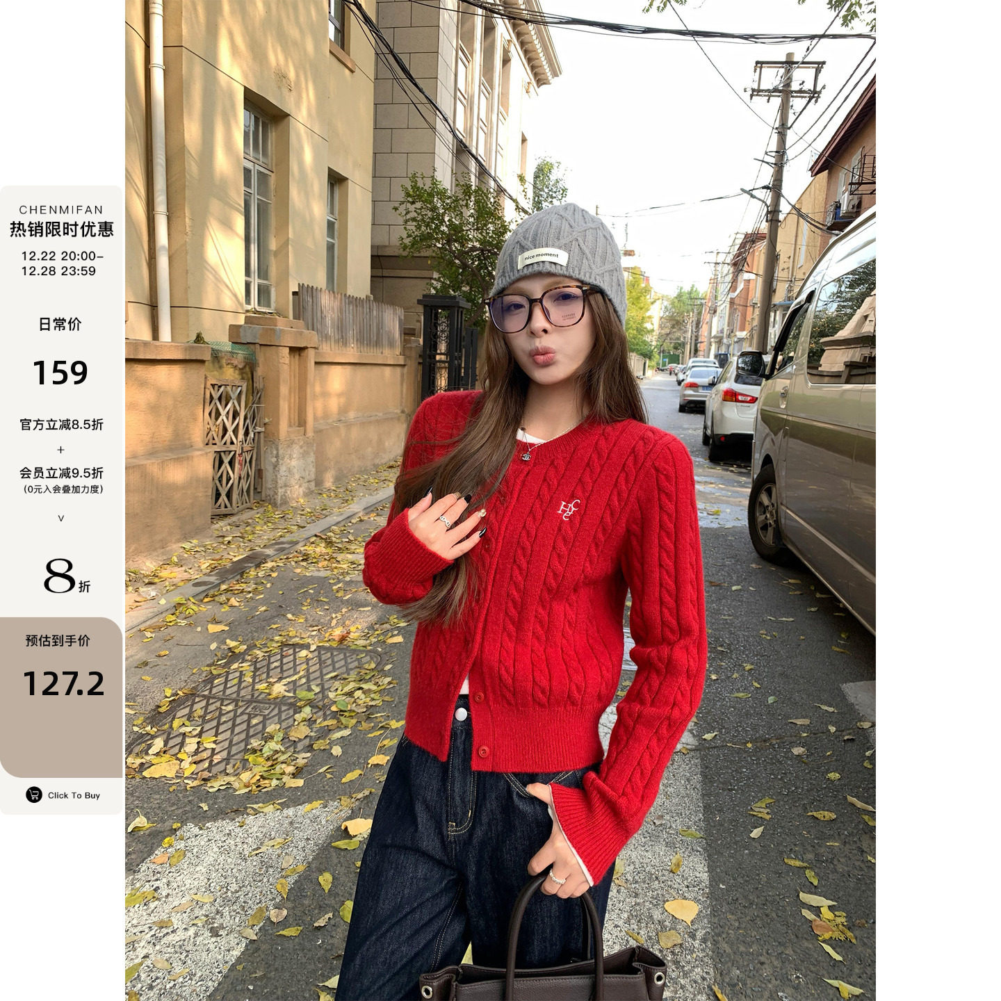 辰米范 红色针织开衫麻花短款毛衣女秋冬修身显瘦圆领上衣小外套