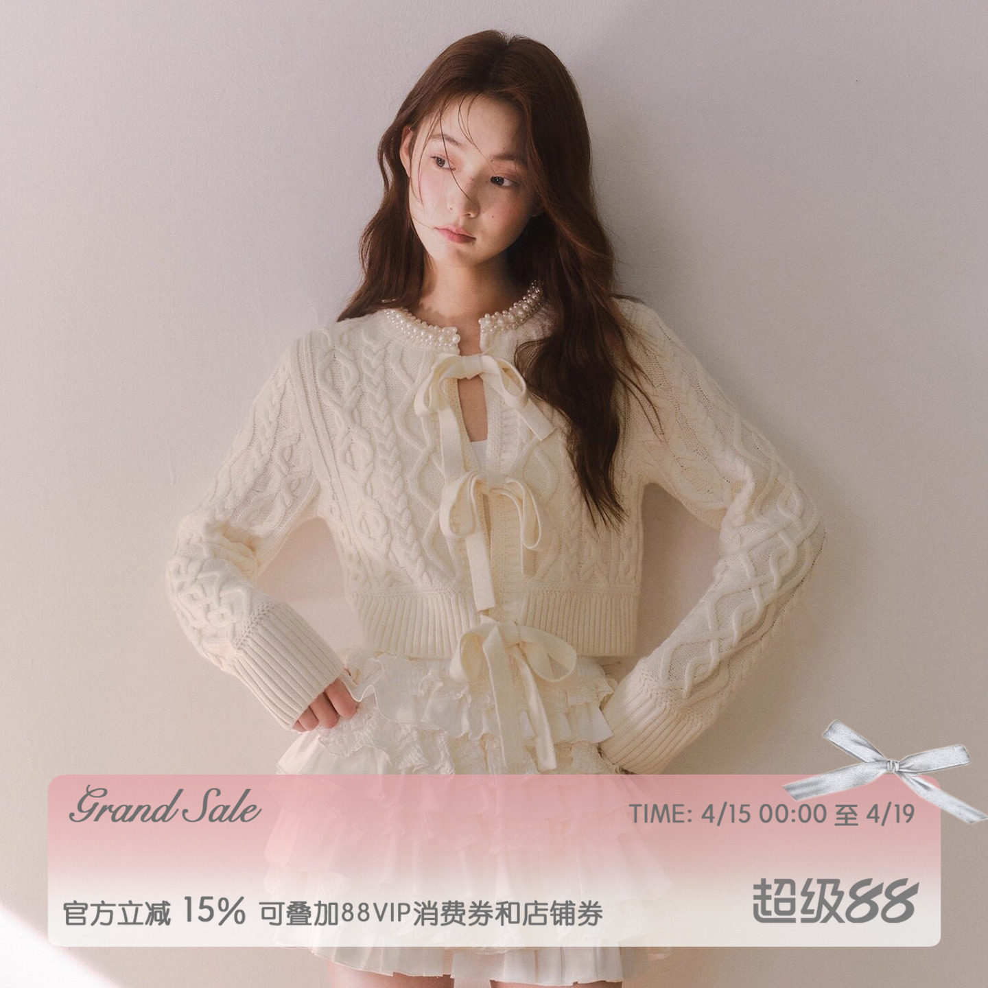 RECIT 复古钩针系带蝴蝶结针织开衫女春装手工珍珠领短款毛衣外套