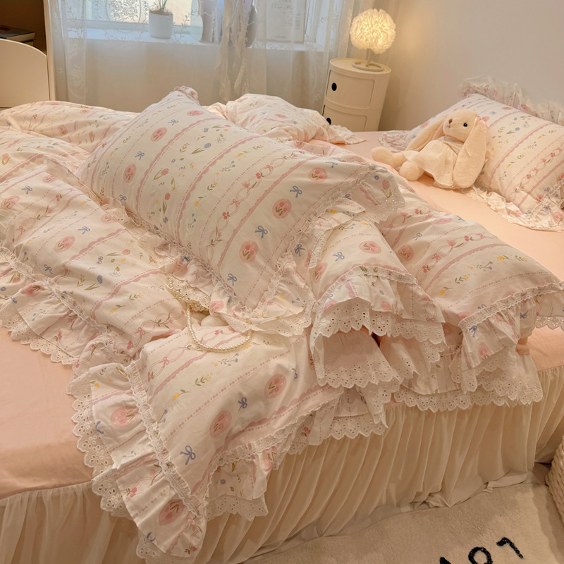 仙女款荷叶边全棉四件套公主风田园风纯棉被套学生3件套1.8米床裙