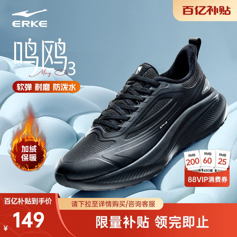 鸿星尔克减震跑步鞋冬季加绒男鞋软底防水运动鞋新款黑色轻便跑鞋