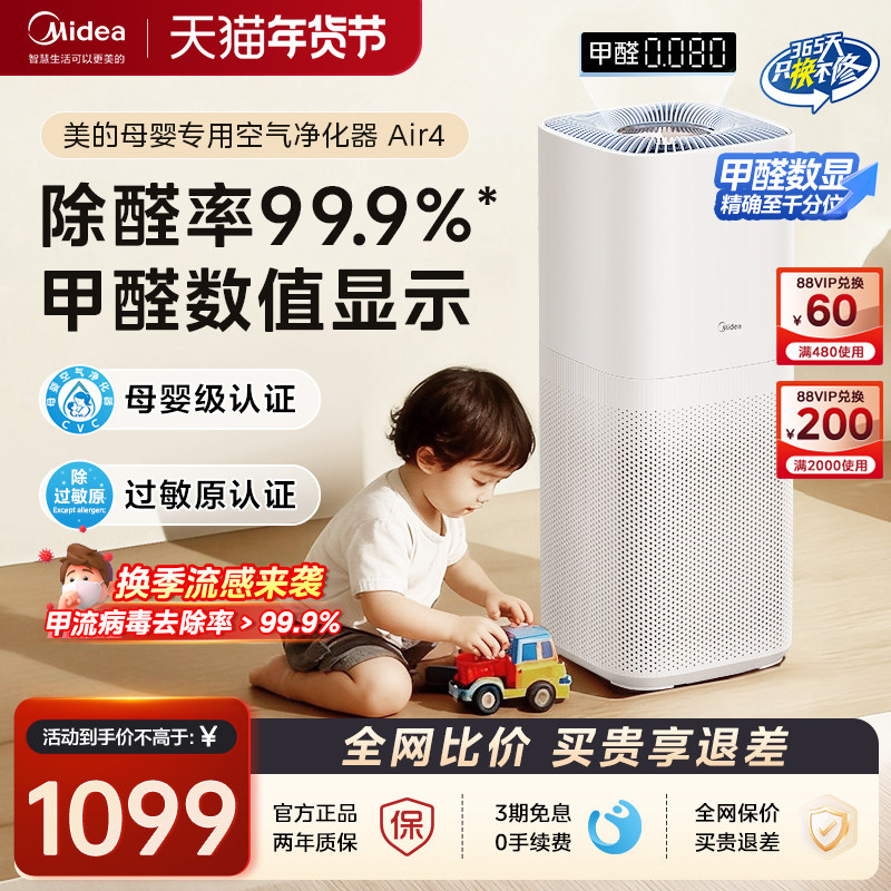 美的空气净化器母婴级消毒杀菌除过敏原除醛数显吸烟净化机Air4