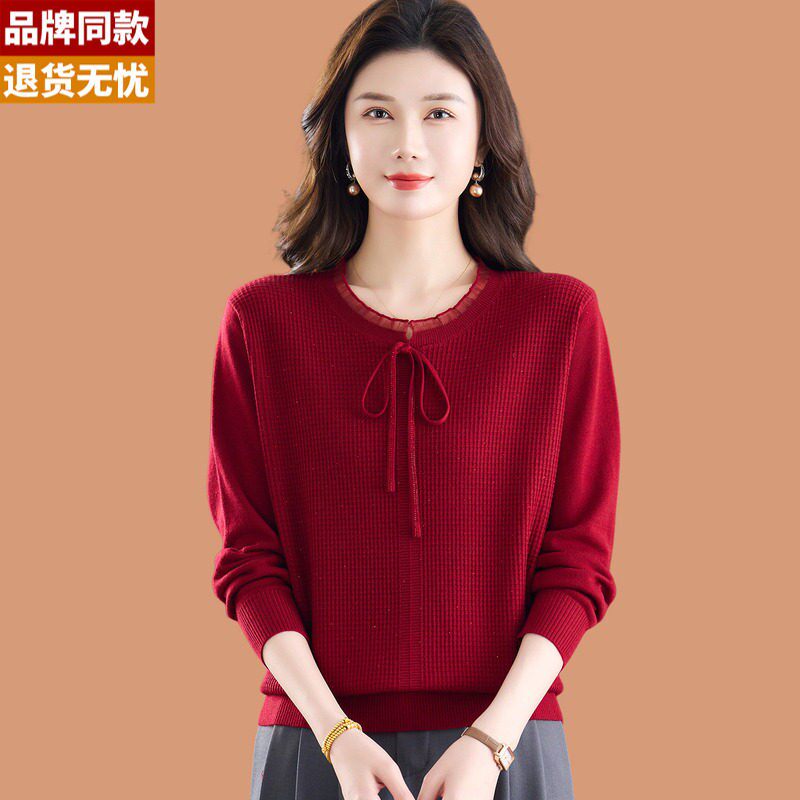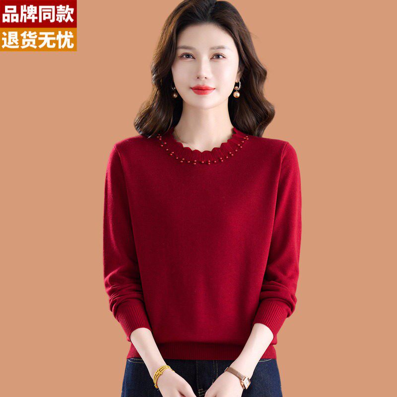 低领钉珠红色毛衣女春装2026新款洋气妈妈宽松薄款羊毛针织打底衫