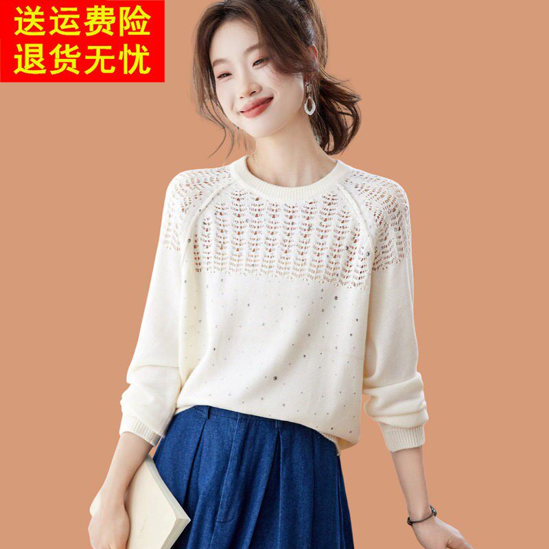 低领毛衣女春秋装2025新款薄款中年妈妈蕾丝烫钻羊毛针织打底小衫