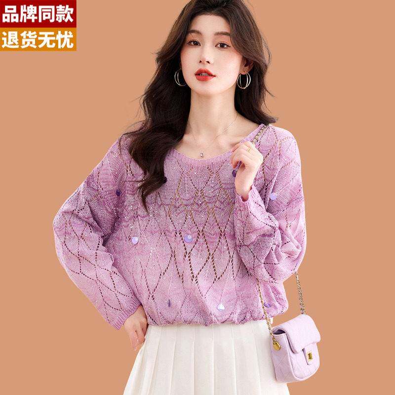 冰丝针织衫长袖t恤女2026春新款时尚薄款镂空一字低领蝙蝠袖上衣