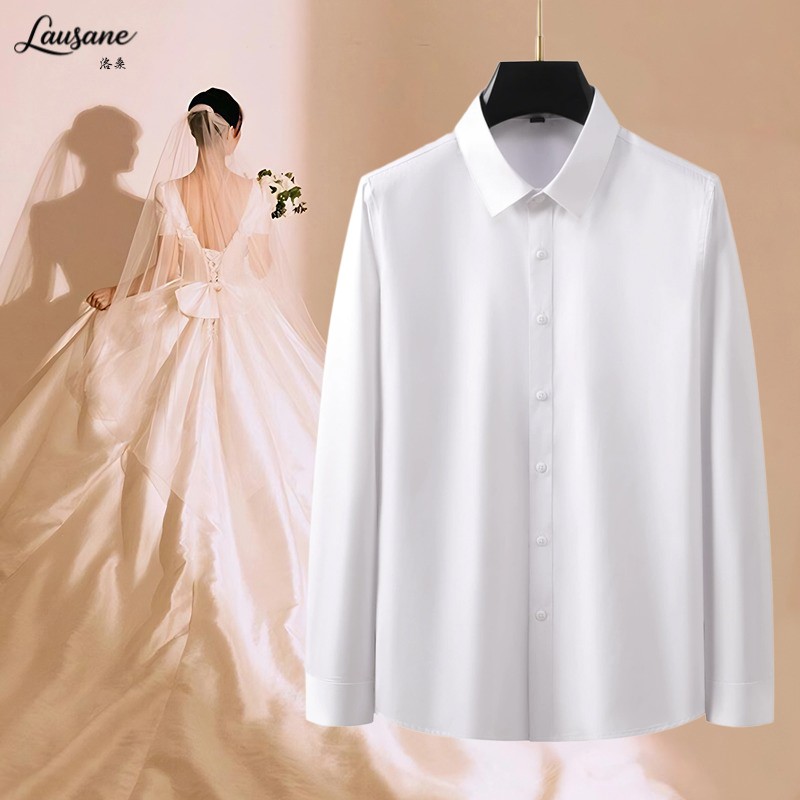 男士白色长袖衬衫高级感韩版弹力修身结婚衬衣西装内搭黑色打底衫