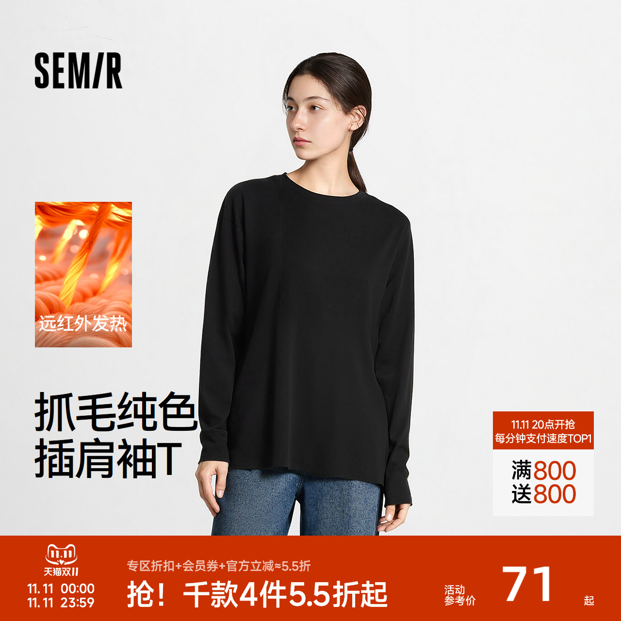 森马长袖T恤女中长款宽松发热纯色插肩袖2025冬新款抓毛开叉上衣