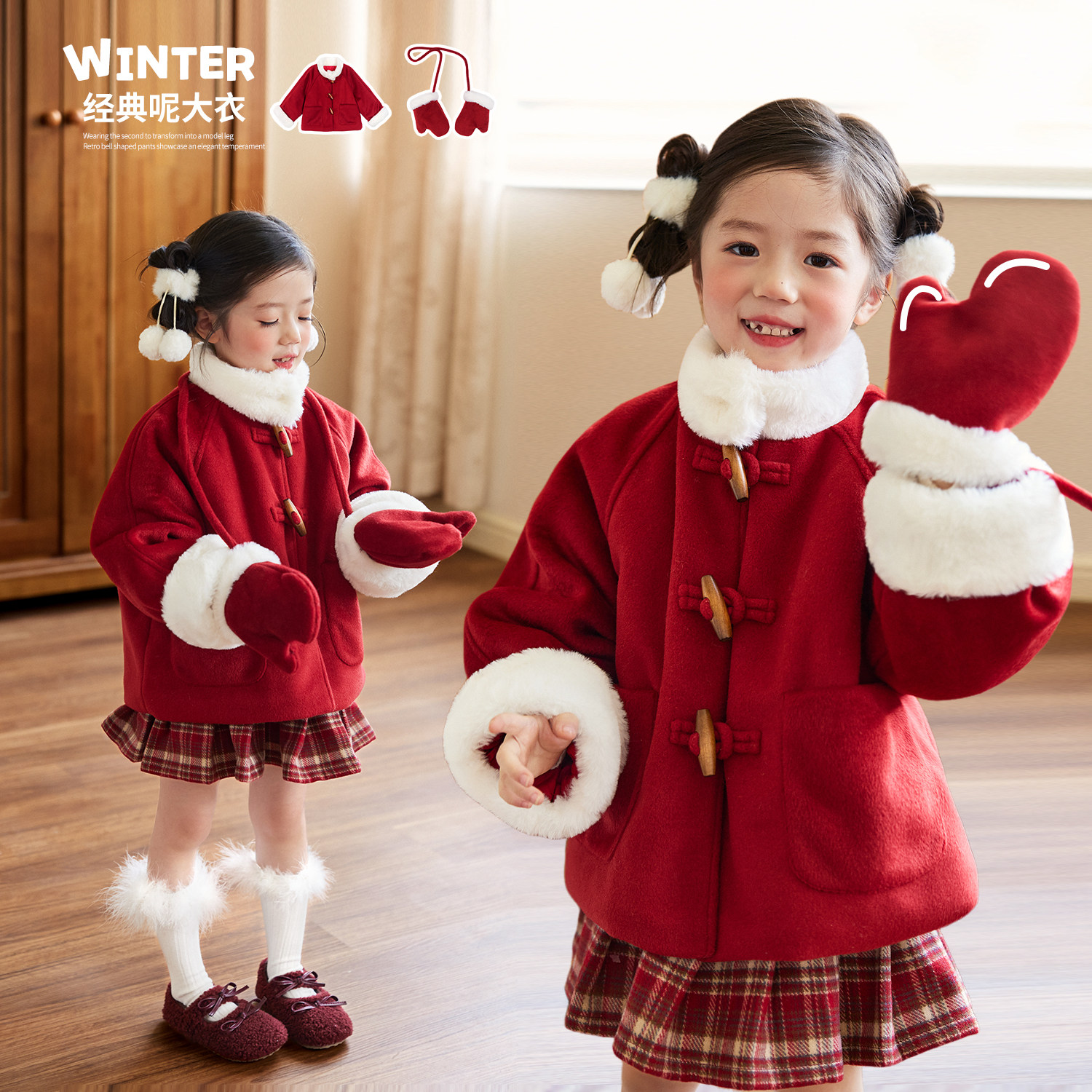 小O宝童装 宝宝红色毛呢大衣女短款2026新款女童红色毛绒过年外套