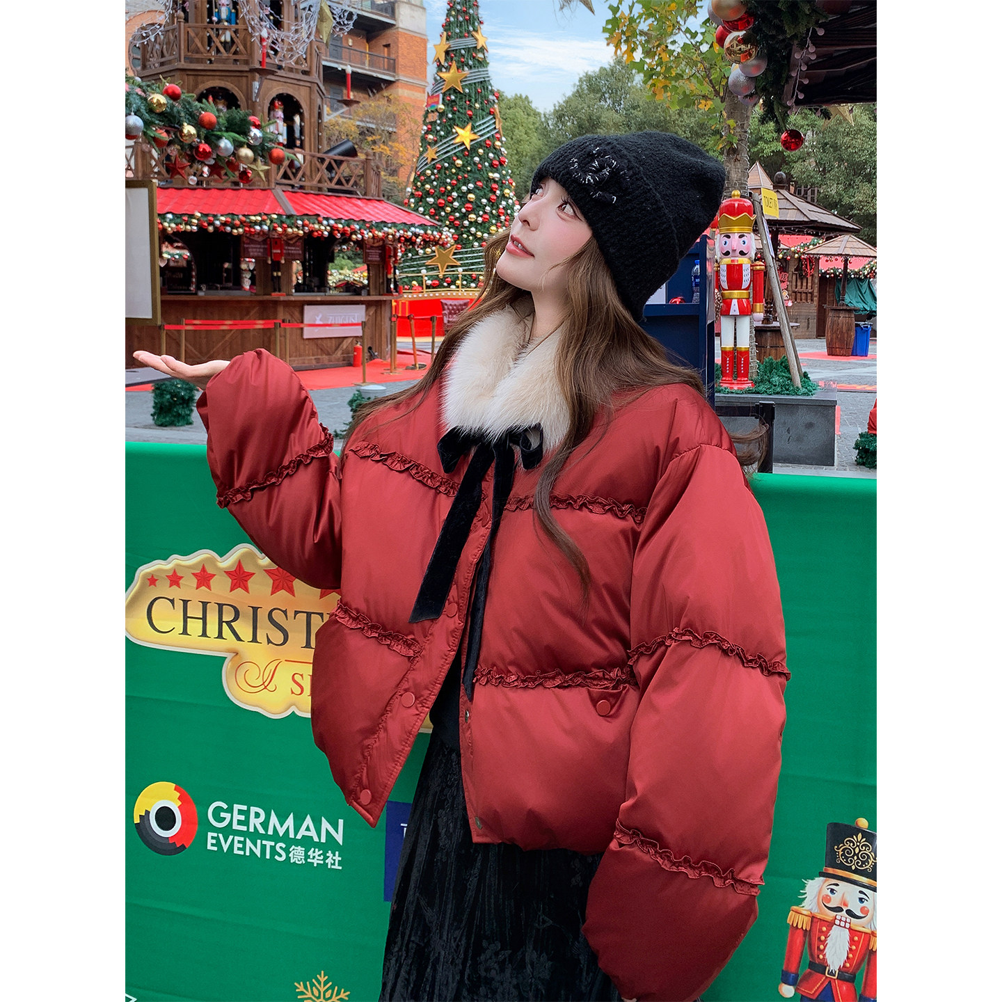 妖精的口袋抓马羽绒服红色短款外套新年战袍女2025冬季新款小个子