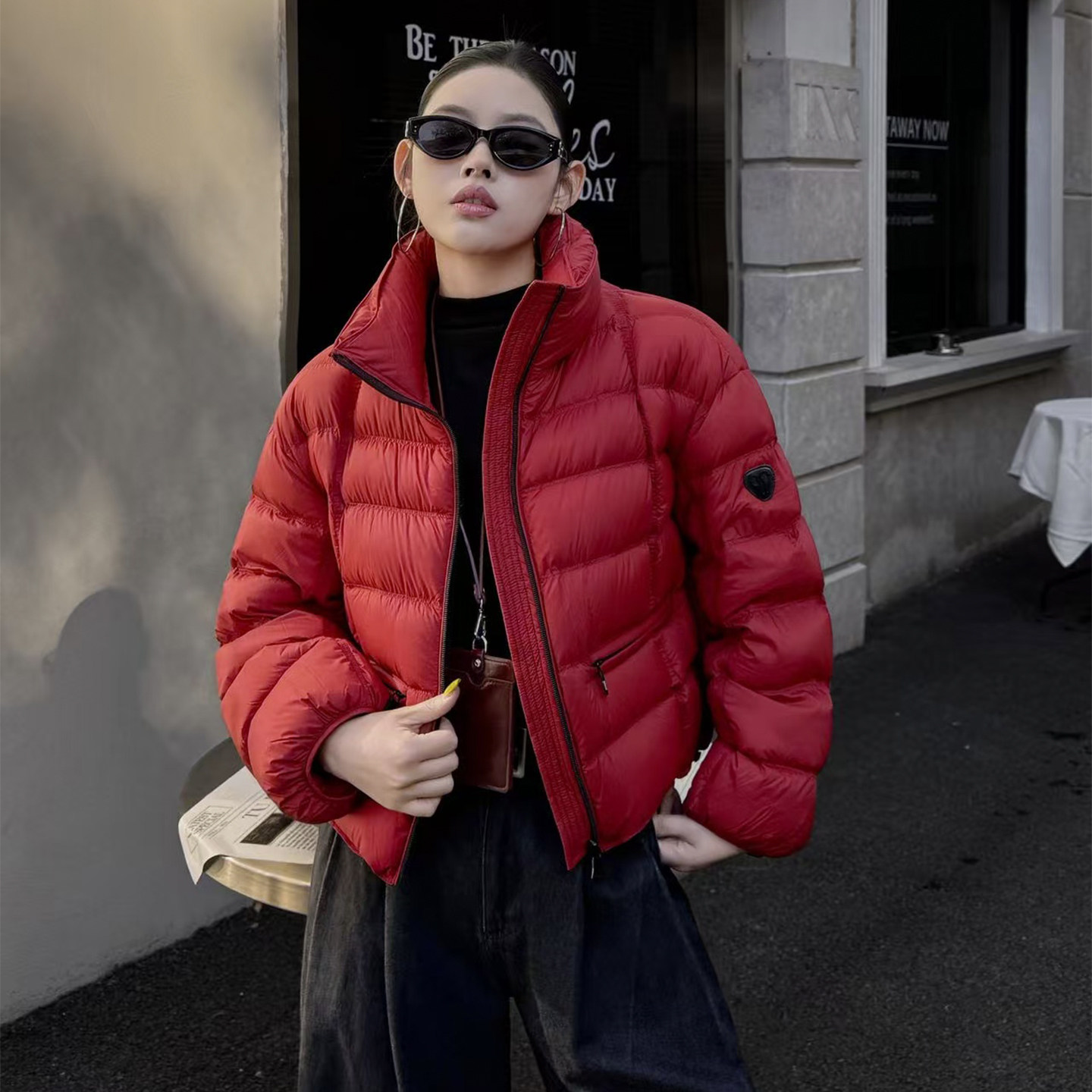 2025冬季新款欧美风时尚轻薄红色羽绒服女短款小个子修身保暖外套