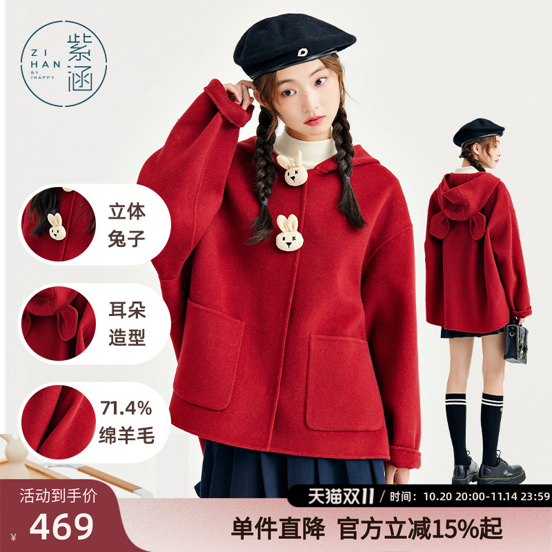 紫涵连帽斗篷双面羊毛呢红色大衣女冬季新款学院风小个子短款外套