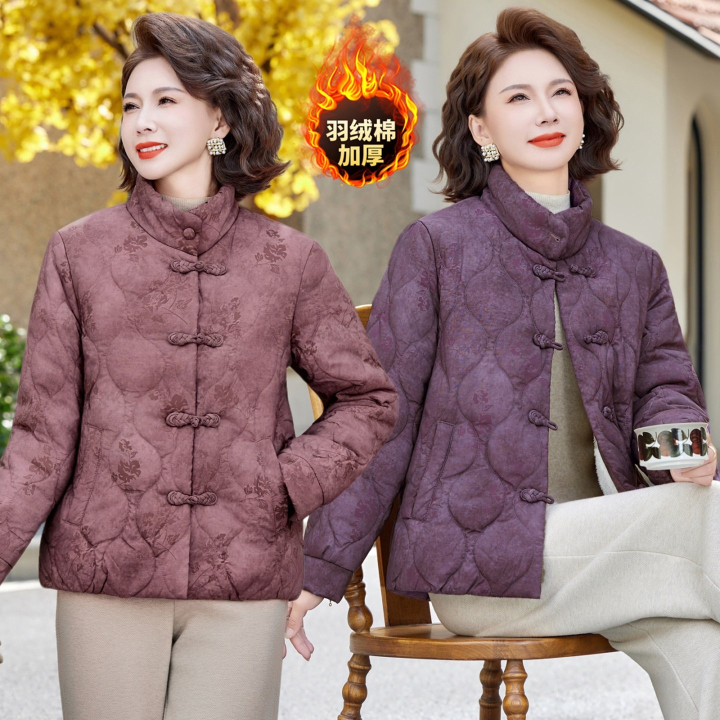 羽绒棉加厚立领复古盘扣棉衣冬季中老年女装妈妈装保暖棉袄外套花