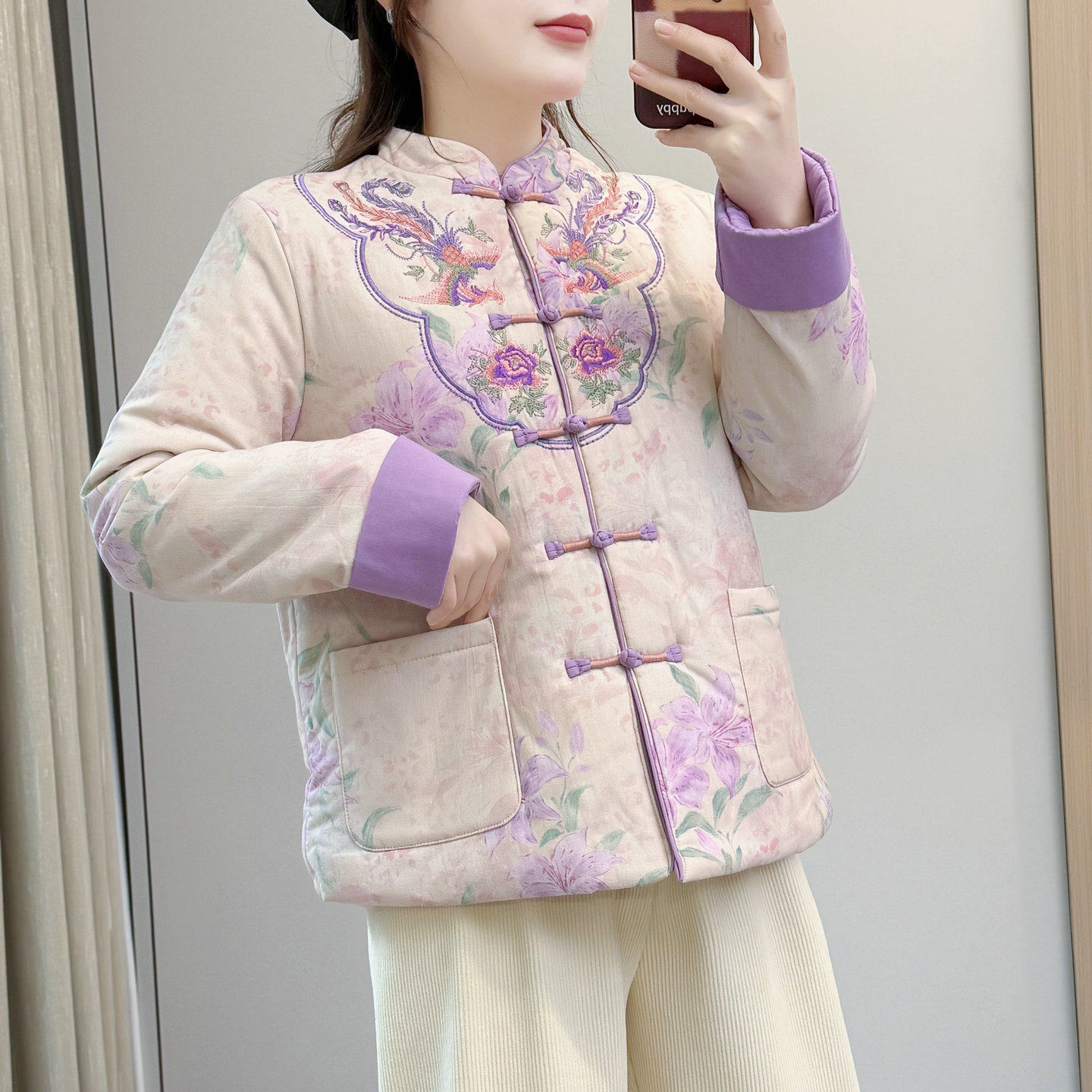 新中式中国风淡紫色印花棉服女2025冬季加绒加厚复古盘扣棉衣外套