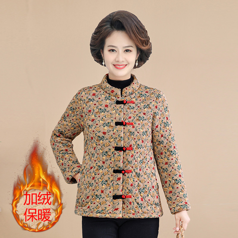 新款洋气妈妈装加绒保暖冬季小花袄中式复古盘扣棉服外套女士棉衣