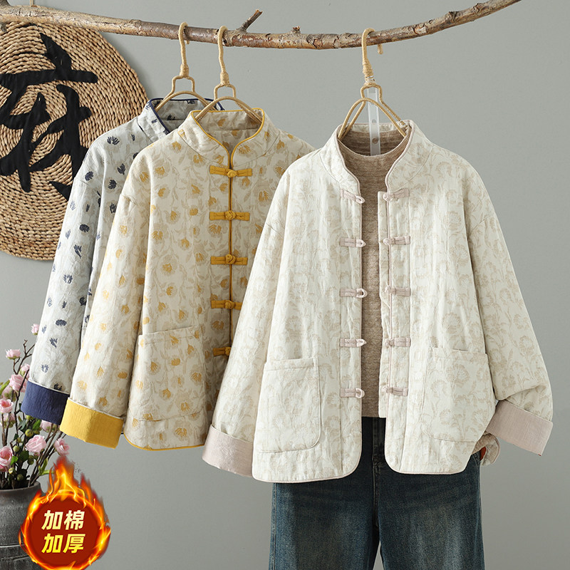 2025秋冬新款复古国风棉麻提花盘扣双面穿棉衣女宽松舒适棉服外套