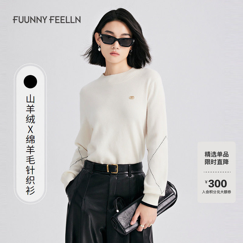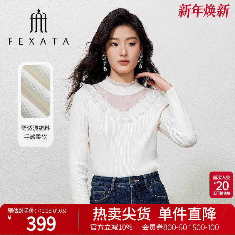 FEXATA斐格思2025冬季新品百搭气质花边蕾丝荷叶拼接白色针织衫女