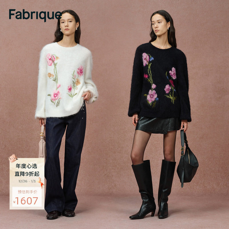 【张俪同款】Fabrique初雪虞美人提花刺绣羊驼毛白色针织衫毛衣女