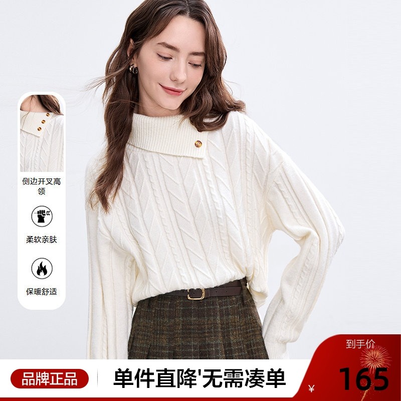 betu百图高领设计感麻花毛衣2025年冬季新款慵懒风白色针织衫