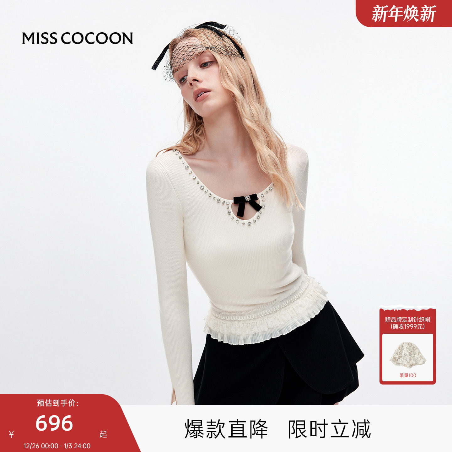 MISSCOCOON可可尼白色针织衫女2025秋冬新款修身大U领羊毛打底衫