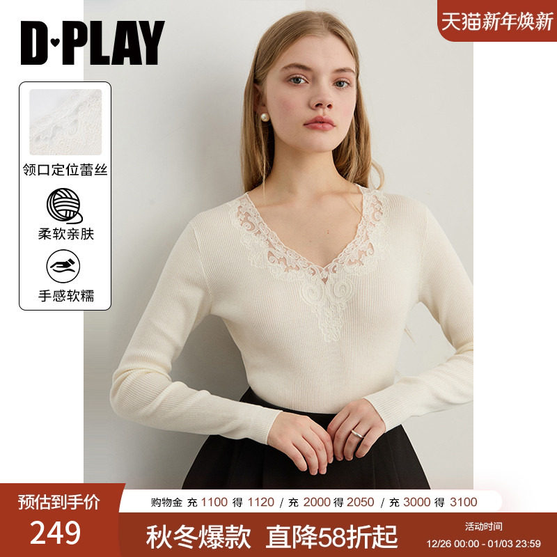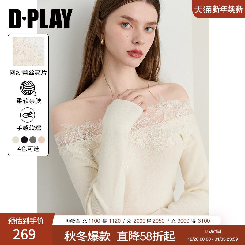 DPLAY2025年秋季新款白色针织衫女蕾丝拼接上衣正肩修身打底衫