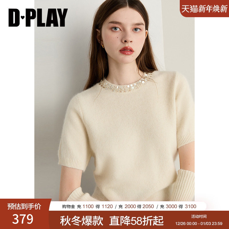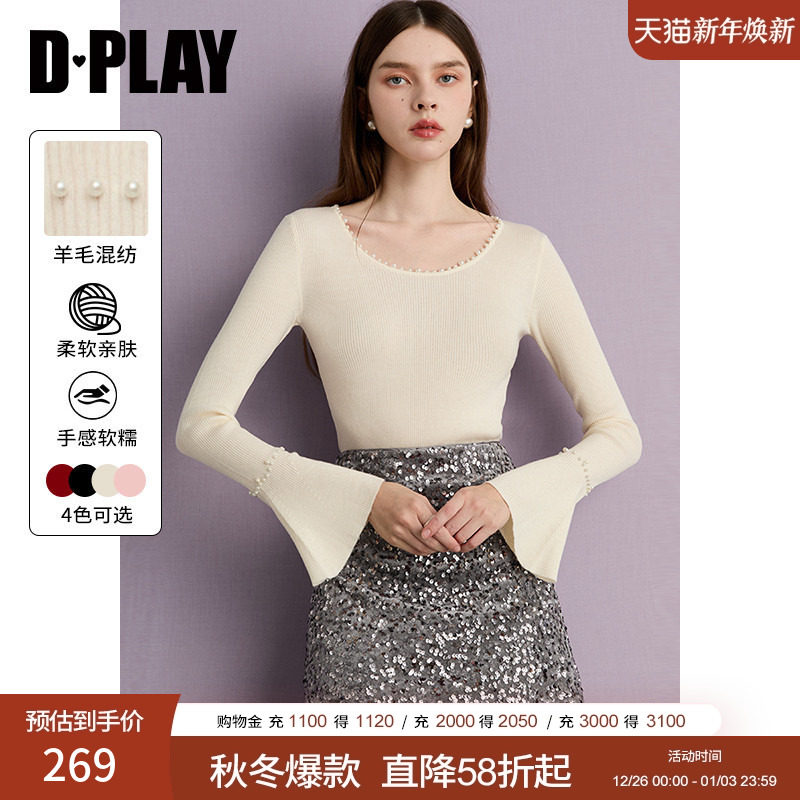 DPLAY2025年秋季新款白色针织衫女羊毛亮片珍珠气质好看时尚上衣