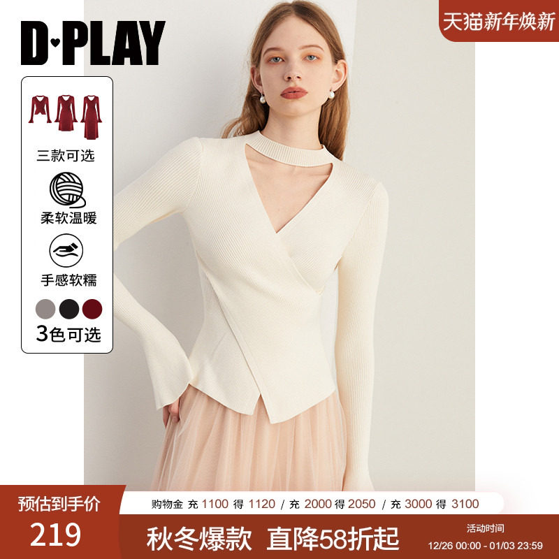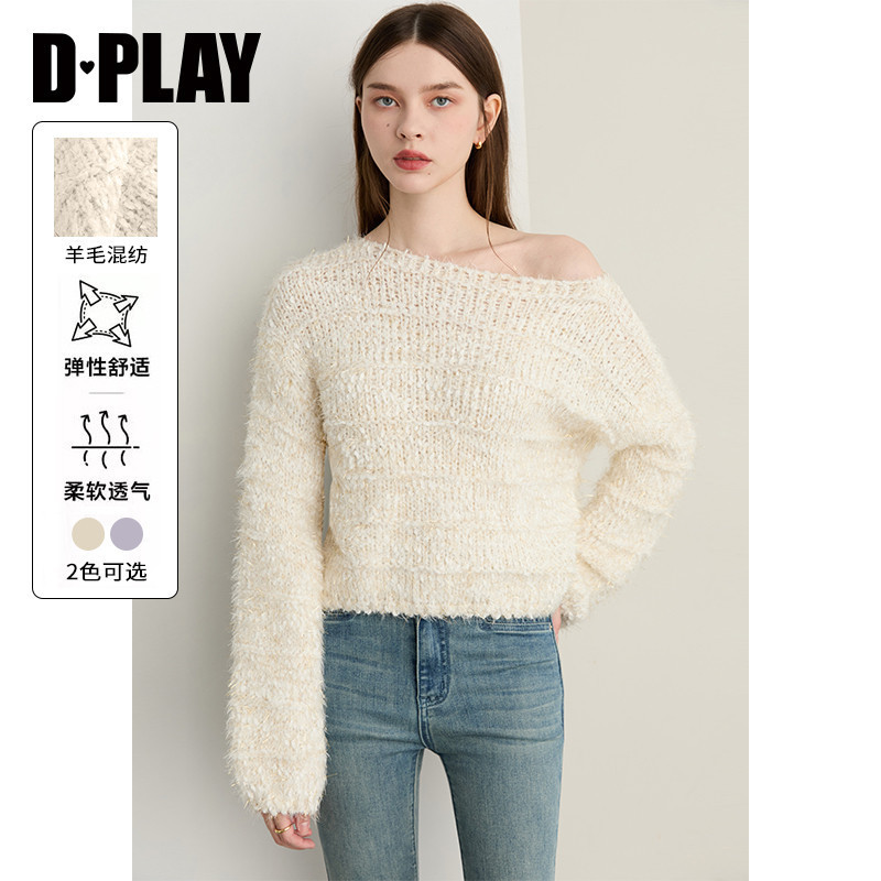 DPLAY2025年秋季新款白色针织衫女露肩羊毛优雅设计感针织打底衫