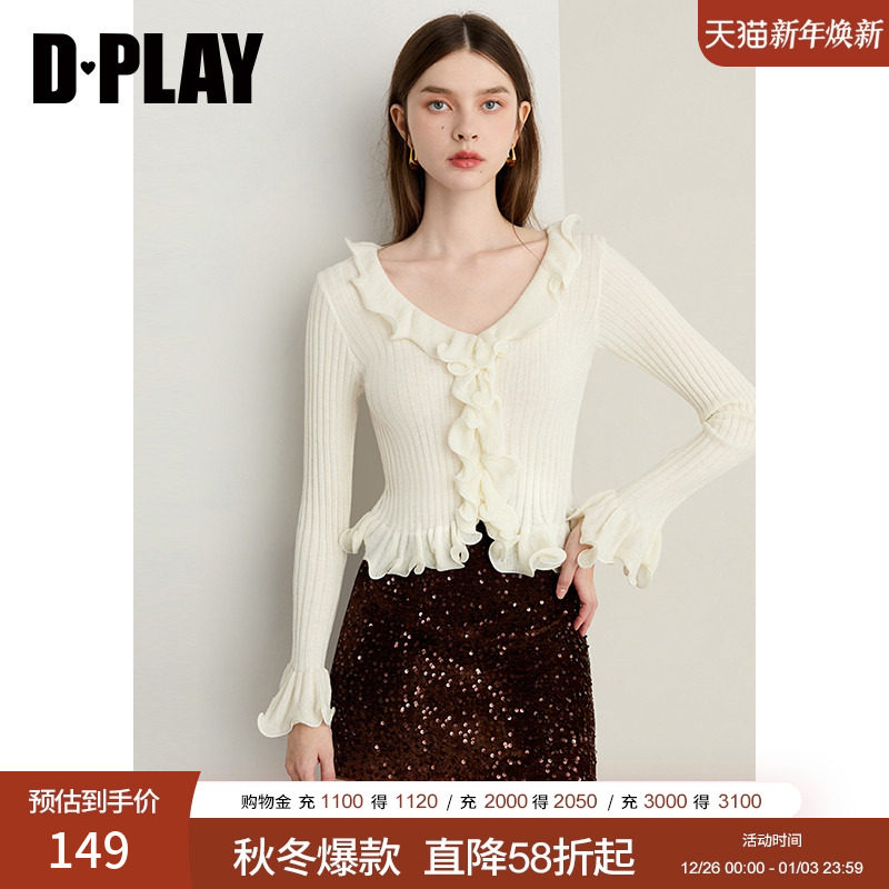 DPLAY2025年秋季新款白色针织衫女荷叶边含羊毛气质开衫外套上衣