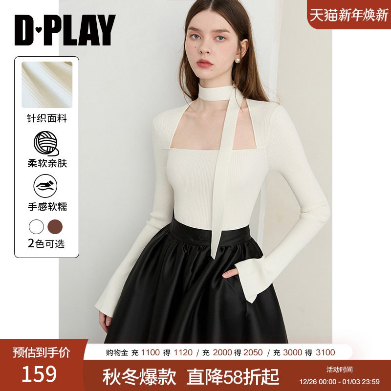 DPLAY2025年秋季新款白色针织衫女法式美背飘带设计修身长袖上衣