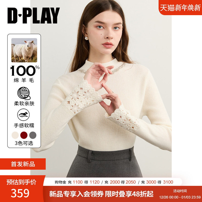 DPLAY2025年冬季新款白色针织衫女100羊毛镂空花边针织打底衫