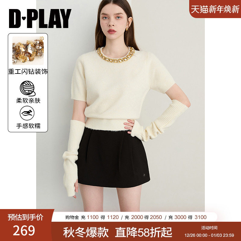 DPLAY【轻奢闪钻系列】2026年春季新款白色针织衫女含羊毛上衣