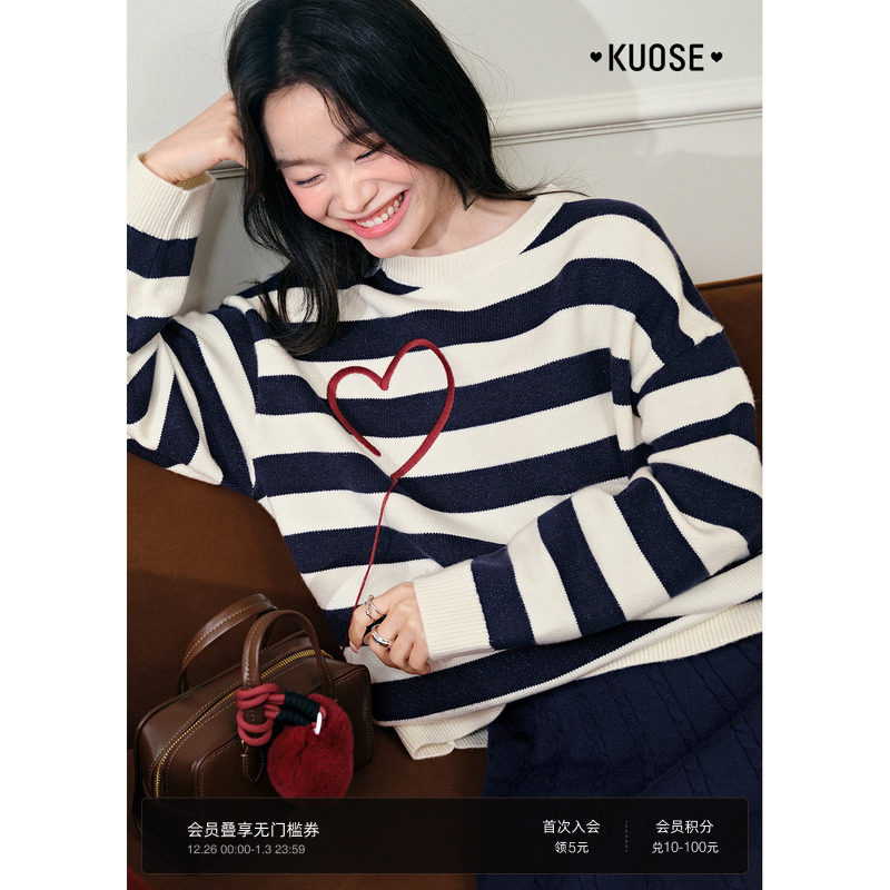 阔色慵懒藏蓝色条纹细闪毛衣女2025秋冬季新款爱心刺绣白色针织衫