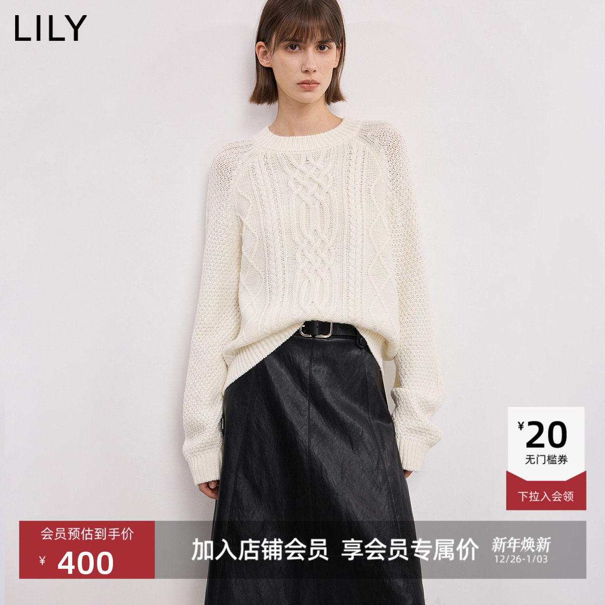 LILY2025冬新款女装羊毛混纺法式绞花重工加厚套头白色针织衫毛衣