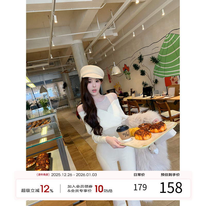DPLAY2025秋季新款白色针织衫女拼接蕾丝修身一字肩羊毛上衣长袖