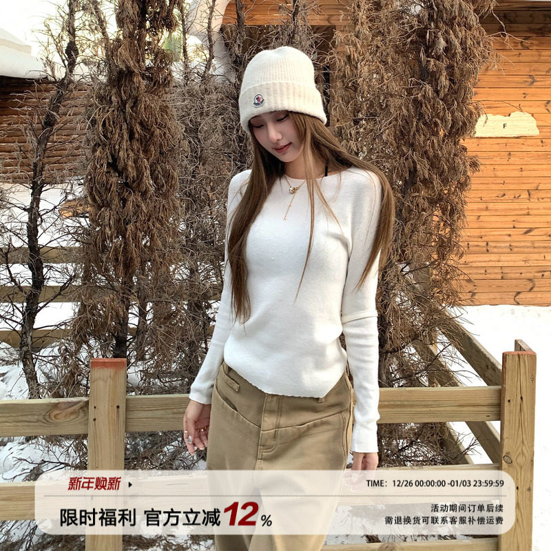 pusumede 松弛感天菜 白色圆领针织打底衫女基础内搭长袖t恤上衣