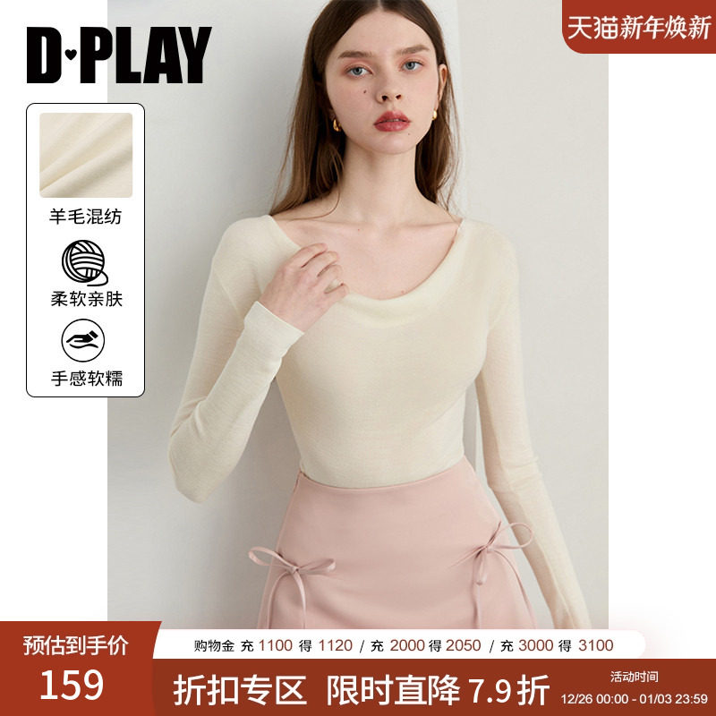 DPLAY2026年春季新款白色针织衫女修身荡领含羊毛打底衫长袖上衣