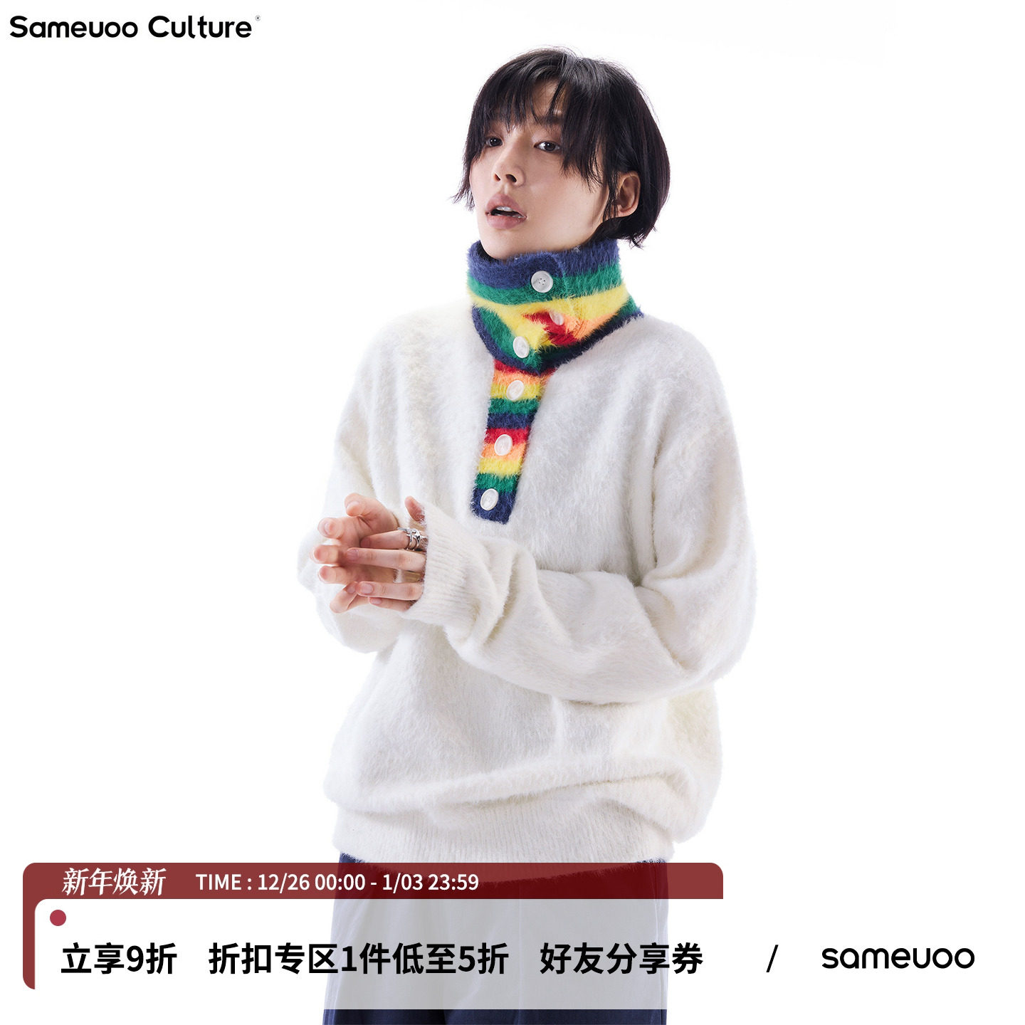 sameuoo散养文化彩虹高领毛衣女秋冬可外穿内搭仿貂毛白色针织衫