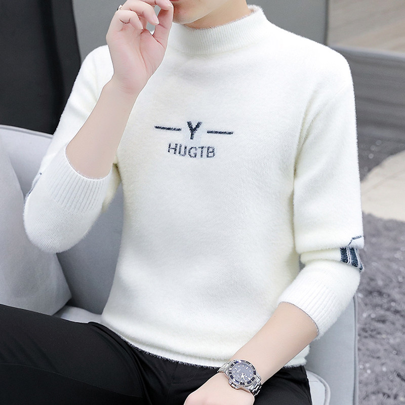 水貂绒毛衣男秋冬季加厚打底衫半高领长袖毛线衣中领白色针织衫男