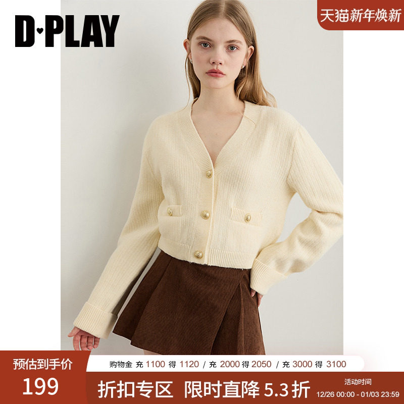 DPLAY2026春白色针织衫女轻奢白月光翻袖金属扣气质针织开衫外套