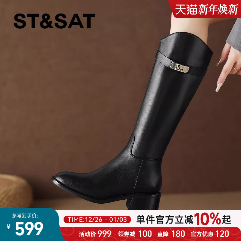 星期六黑色长靴女2025秋冬圆头锁扣不过膝骑士靴英伦风粗跟直筒靴