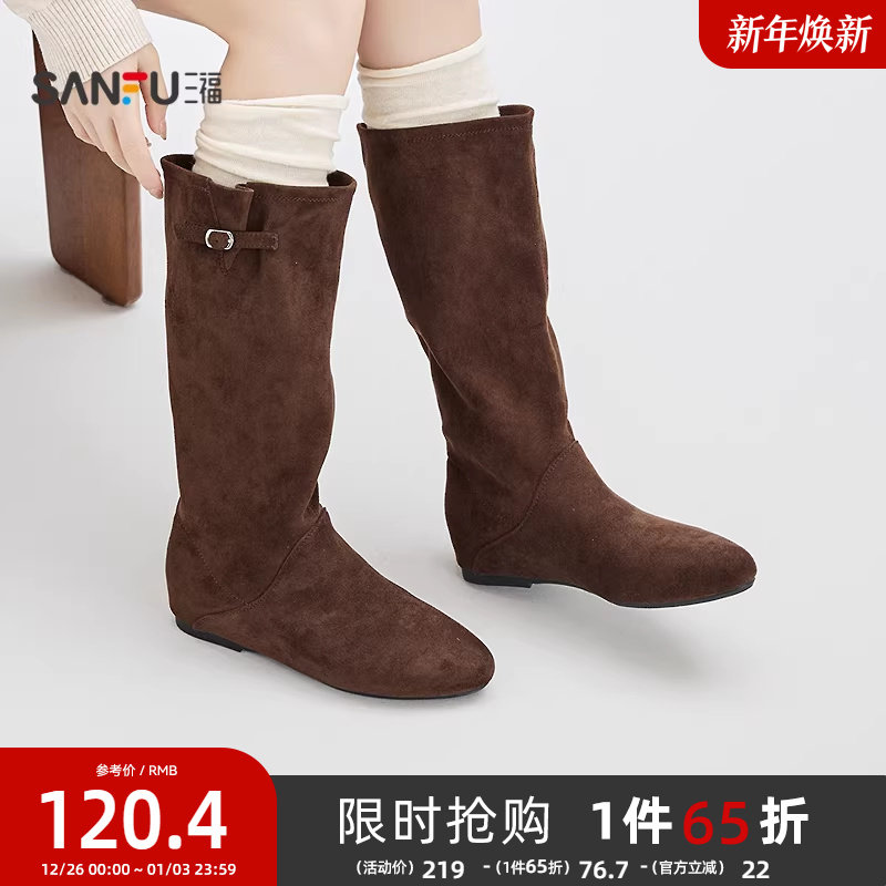 三福女靴鞋冬季静奢老钱风侧边单扣纯色圆头长靴女鞋848916