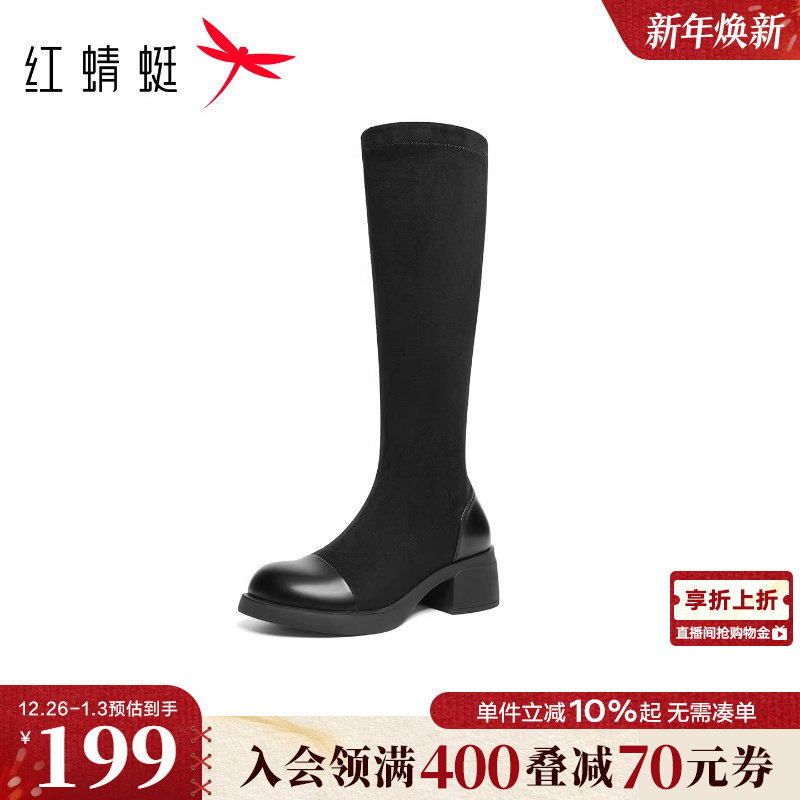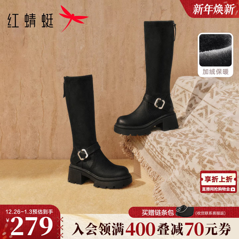 红蜻蜓长靴女2025冬季新款女鞋靴子粗跟长筒靴加绒保暖瘦瘦高筒靴