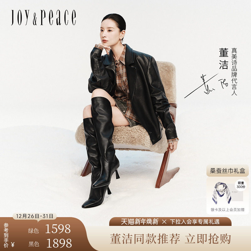 董洁同款真美诗回头率2025冬新款羊皮高跟堆堆靴时装瘦瘦靴长靴女
