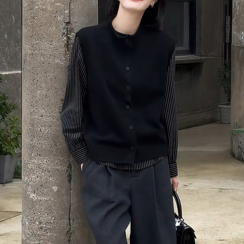 复古条纹风套装长袖衬衫女秋季马甲针织衫时尚宽松巨显瘦气质上衣