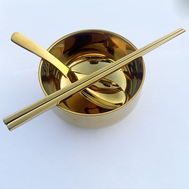 亮光金饭碗韩国碗304不锈钢金色碗筷三件套家用套装双层金碗韩式