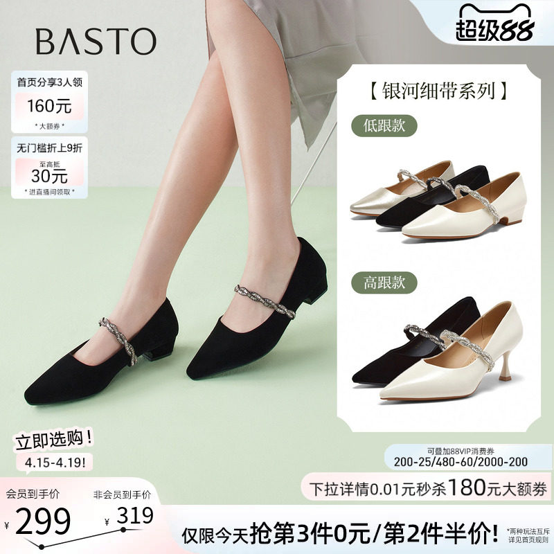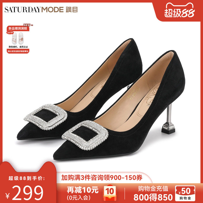 苏妃妃法式水钻方扣绒面高跟鞋女细跟春季新款小个子尖头职业单鞋